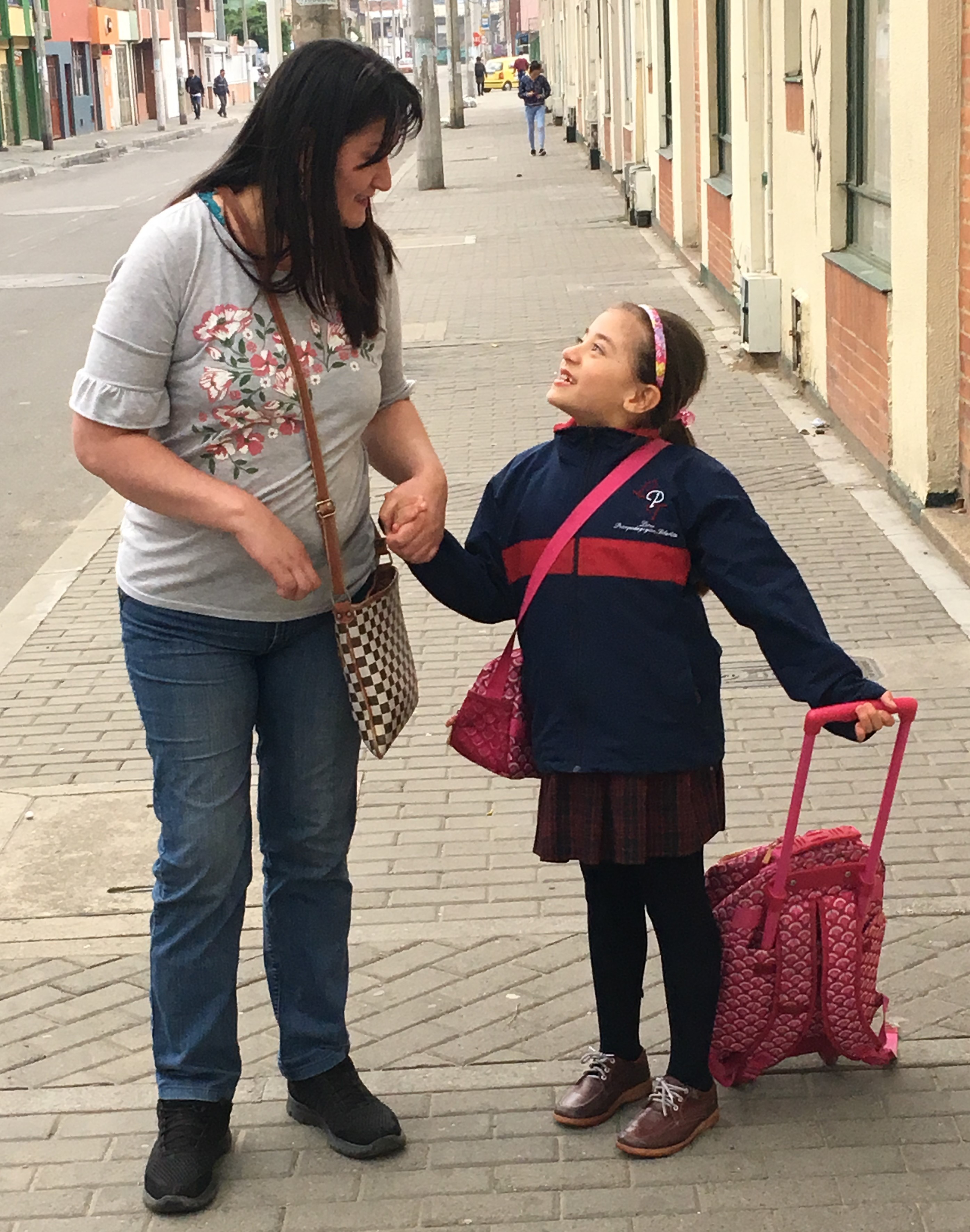 Marcela recogiendo a María José del colegio: Marcela todos los días lleva y recoge a María José del colegio, con esto ella logra estar ocupada. (Foto: Martín Romero)