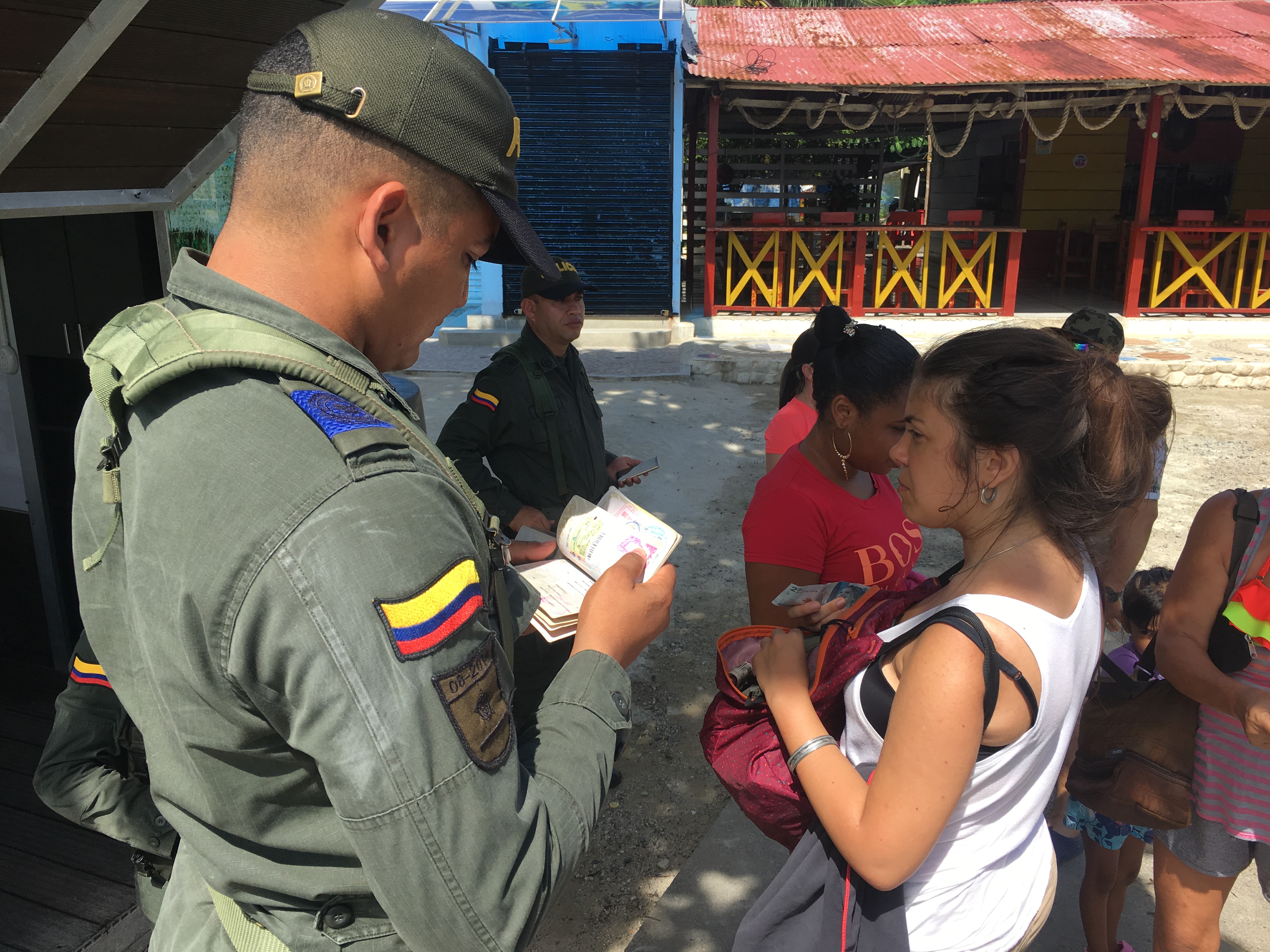 Oficiales de la Policía de Sapzurro, población fronteriza con Panamá, revisan los documentos de los pasajeros que llegan en botes por el muelle. (Foto: Liga Contra el Silencio)