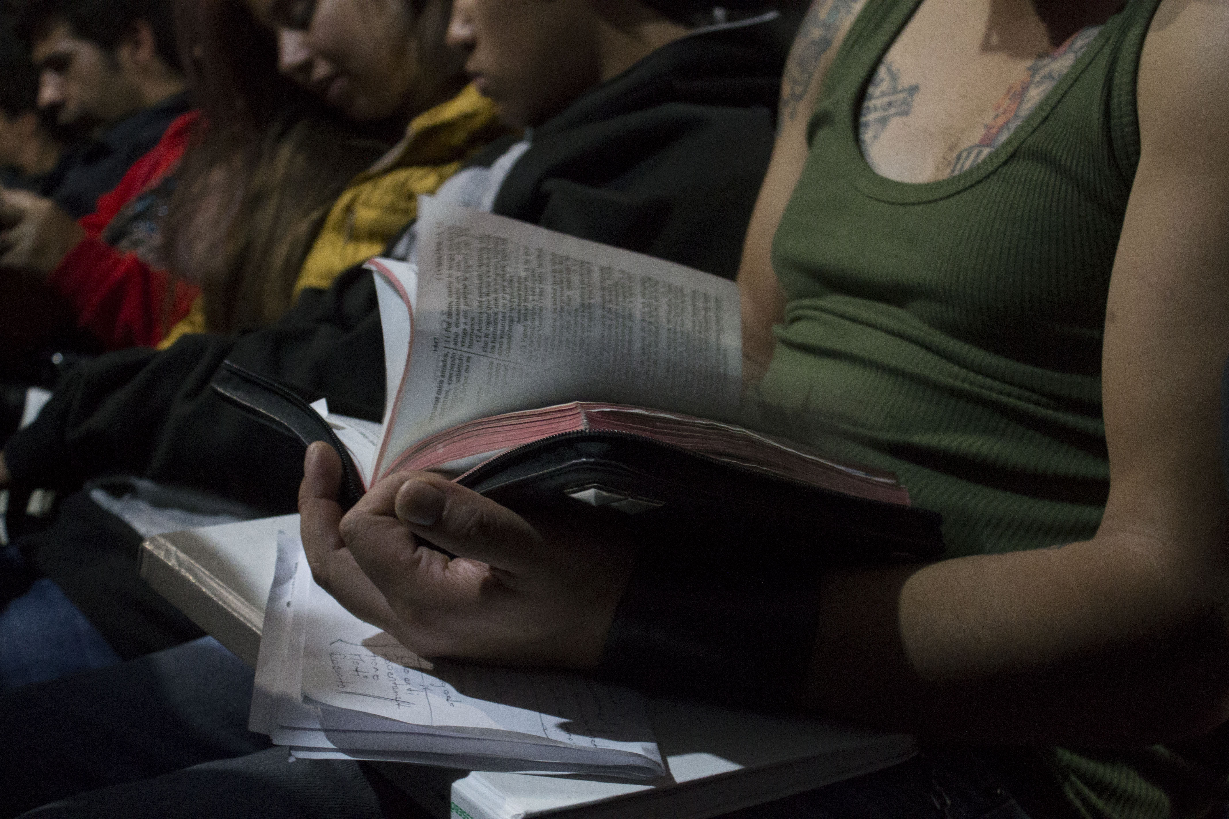 Con el sonido de las cadenas que cuelgan de su pantalón, Carlos se sienta, acomoda sobre su nariz las gafas de marco blanco y negro y toma su biblia. Está forrada en cuero y en el centro de la portada tiene tres taches pegados en línea vertical y tres en una línea horizontal, que juntas forman una cruz. La abre para buscar el libro de Hechos y lo encuentra como quien sabe de memoria qué tiene guardado en su mesa de noche. Se detiene en el capítulo 17, aclara su garganta y con voz firme, suave y pausada lee el sexto verso: “pero no hallándolos, trajeron a Jasón y a algunos hermanos y los arrastraron ante los gobernadores, gritando: ¡Estos que trastornan el mundo también han venido hasta aquí!”. Alza la mirada y dice:
