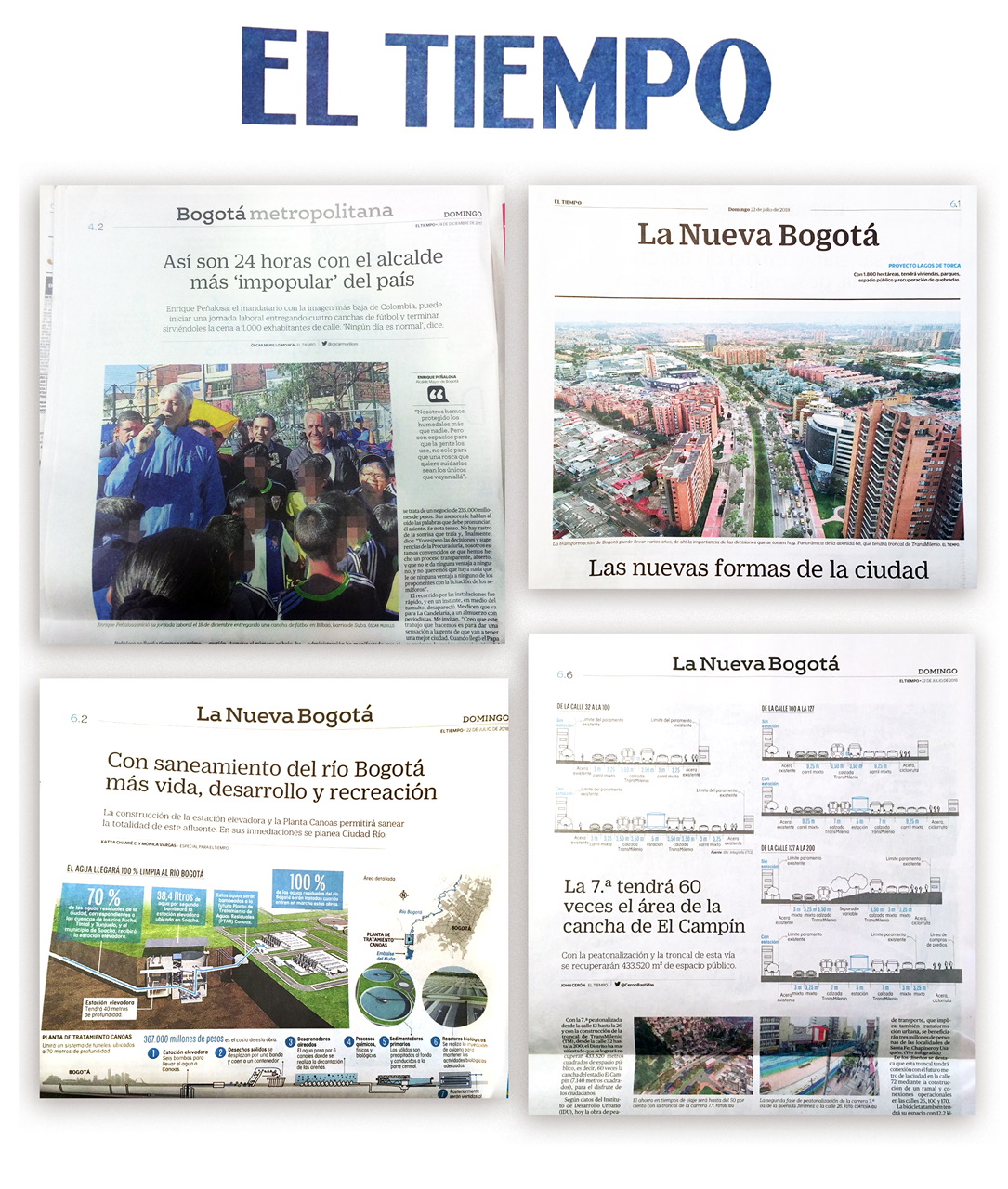 En una nota publicada el 13 de junio de 2018 en su edición impresa (y luego en su edición virtual), El Tiempo tituló que “Bogotá está en obra”, con una ejecución de “61 billones de pesos —unos 20.000 millones de dólares, que es lo que cuestan dos mundiales de fútbol o el equivalente a cuatro presupuestos completos de Bogotá— en vías, colegios, jardines y canchas deportivas”. En dos páginas completas, firmadas por la Sección Bogotá del diario, y acompañadas de varios gráficos, se asegura que “la ciudad registra un auge de la construcción civil como no se veía desde hacía más de una década”.