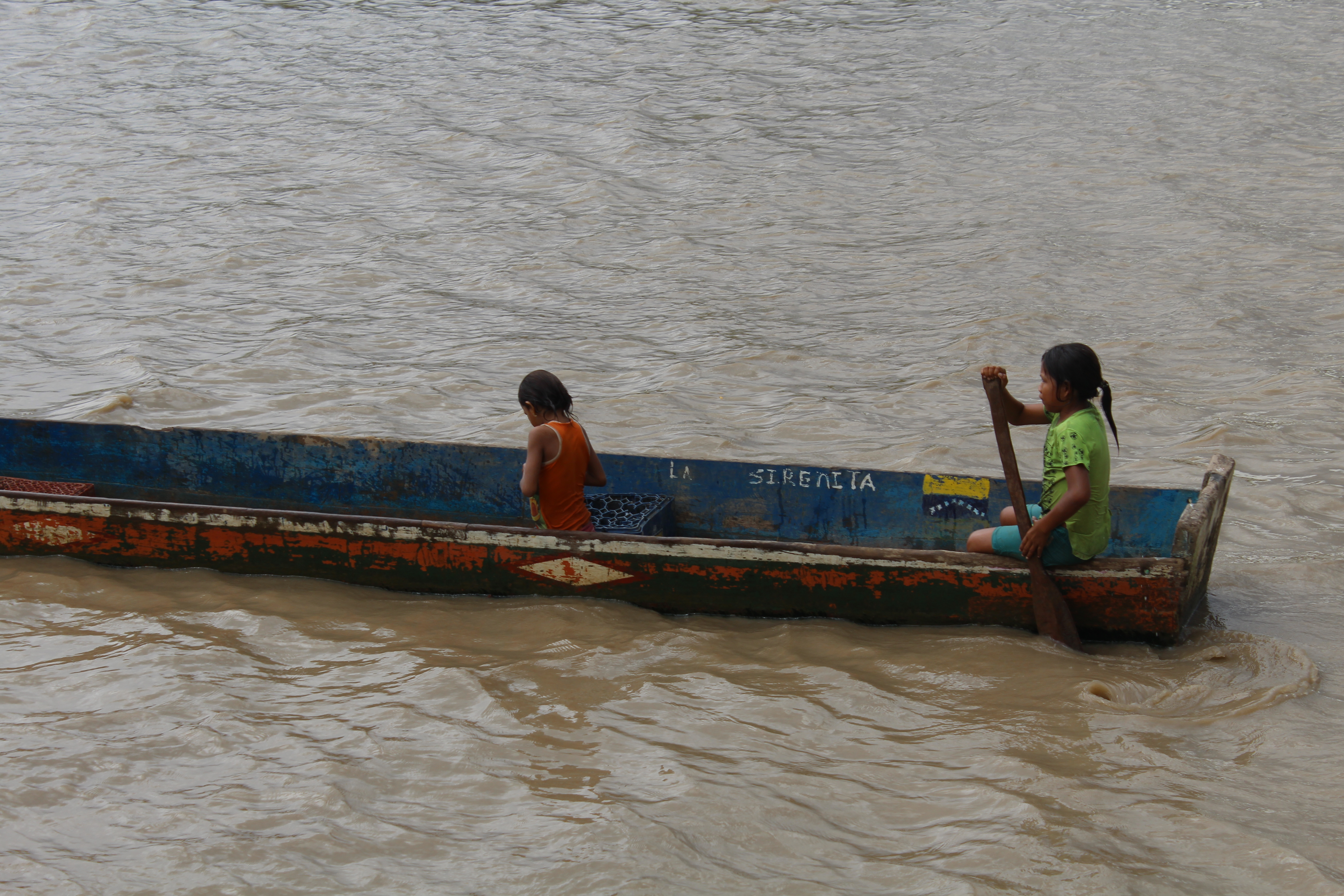 Tanto los adultos como los niños saben navegar canoa sin ningún problema, desafían el río y de esta manera pasan a Venezuela y vuelven a Colombia cada vez que lo necesitan. Foto de Mary Ramírez.