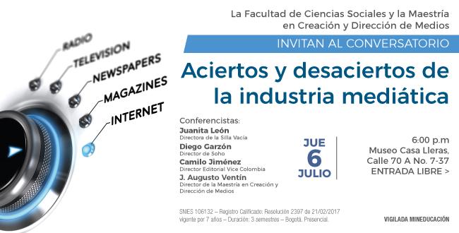 El próximo jueves 6 de julio, a las 6 p. m. en la Casa Lleras (calle 70A #7-35), cuatro directores de medios de comunicación colombianos se sentarán a dialogar sobre los aciertos y desaciertos de la industria mediática. El evento, promovido por la Maestría en Creación y Dirección de Medios de Utadeo, pretende generar un cruce de miradas y enfoques entre los diferentes invitados.
