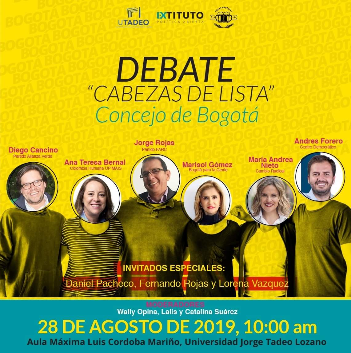 En el debate tendremos la presencia de Ana Teresa Bernal de Colombia Humana UP MAIS; Andrea Nieto de Cambio Radical; Marisol Gómez Giraldo de Bogotá Para la Gente; Diego Cancino del Partido Alianza Verde; Jorge Rojas del partido Farc; y Andrés Forero del Centro Democrático.