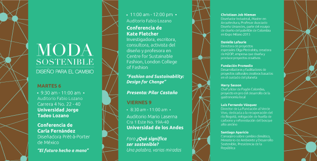 En este año se han juntado las universidades Jorge Tadeo Lozano y de los Andes en un evento donde se comparte una sola mirada en cuanto a la sostenibilidad, no solamente en el ámbito académico y educativo sino también en el tema de empresa y producción de la moda. Se ha invitado como cierre de la semana de la moda sostenible a un panel de expertos en diferentes campos de la sostenibilidad. Se verán miradas de colombianos en arquitectura, gastronomía, producto, medio ambiente y moda.