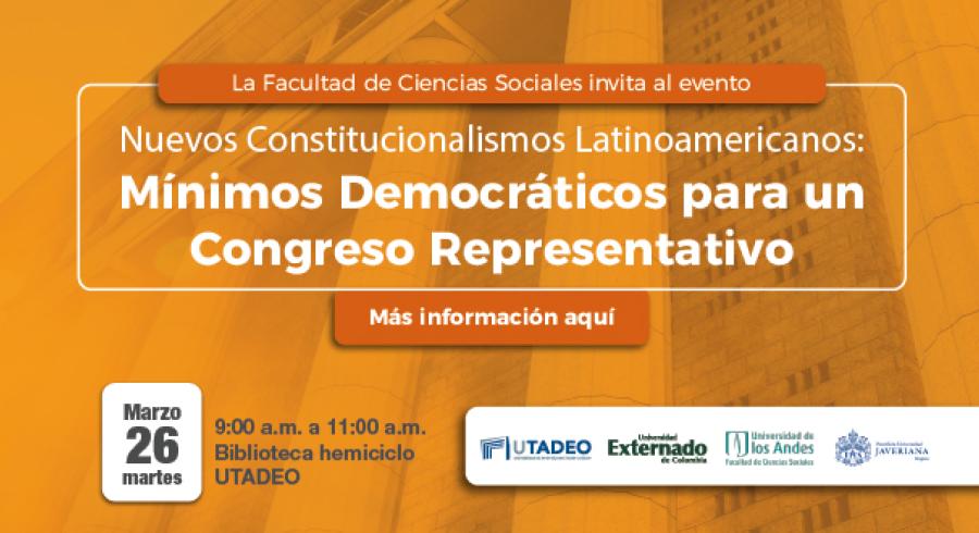 El Departamento de Ciencias Jurídicas de la Facultad de Ciencias Sociales de Utadeo, invita a su ciclo “Nuevos Constitucionalismos Latinoamericanos”. En su segundo evento del año, el evento girará en torno a los 'Mínimos Democráticos para un Congreso Representativo' y se desarrollará el día 26 de Marzo de 2019.
