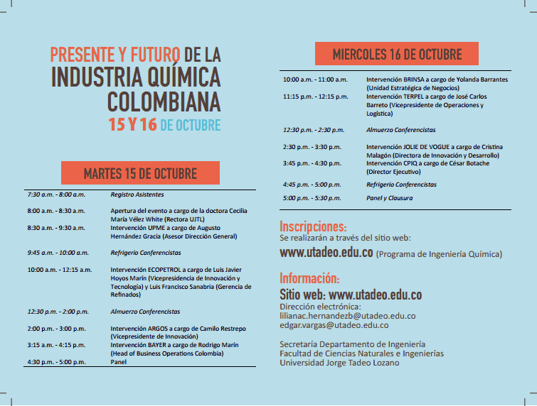 El programa de Ingeniería Química de la Universidad Jorge Tadeo Lozano trae a la comunidad académica el evento “Presente y Futuro de la Industria Química Colombiana”, con el ánimo de crear un espacio donde se comunique y contextualice a estudiantes y profesores en el quehacer y proyección a futuro de importantes empresas del sector productivo del país al interior del marco de la competitividad de sus negocios frente a la globalización. Para ello, los representantes invitados compartirán sus conocimientos en aspectos como: cadenas de suministros, esquemas de procesos productivos, mercados que impactan con sus productos, programas de sostenibilidad ambiental, planes de expansión, procesos de renovación tecnológica, impacto de los tratados de libre comercio en su dinámica económica y la importancia del desarrollo de nuevas habilidades por parte del ingeniero químico para hacer frente a los retos del país.