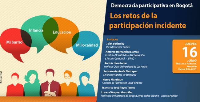 Para dar respuesta a estas, entre otras preguntas, el Programa de Ciencia Política y Gobierno de la Universidad Jorge Tadeo Lozano, junto con el semillero de investigación “Participación Ciudadana y Gobernanza Urbana”, organizan el seminario “Democracia participativa en Bogotá: Los retos de la participación incidente”.