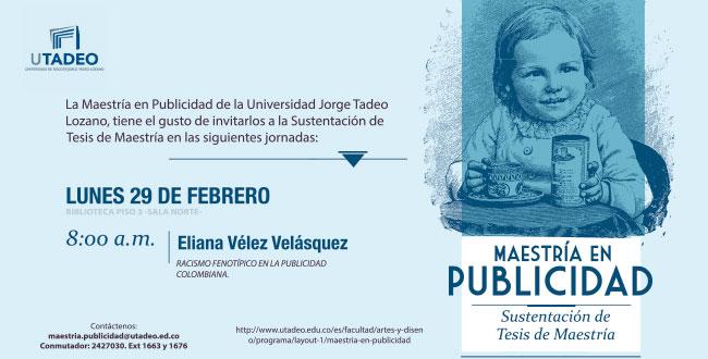 La Maestría en Publicidad de la Universidad Jorge Tadeo Lozano, tiene el gusto de invitarlos a la Sustentación de Tesis de Maestría a cargo de Eliana Vélez Velásquez. "Racismo Fenotípico en la Publicidad Colombiana".