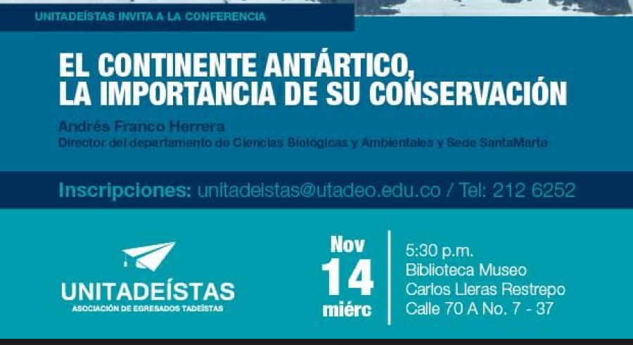 La Asociación de Egresados Tadeístas –UNITADEÍSTAS-, se complace en invitar a la conferencia que dictará nuestro afiliado Andrés Franco Herrera, Biólogo Marino y PhD en Oceanografía de la Universidad de Concepción (Chile) e Investigador de la III Expedición Antártica “Almirante Padilla”, sobre el Continente Antártico y la importancia de su conservación.