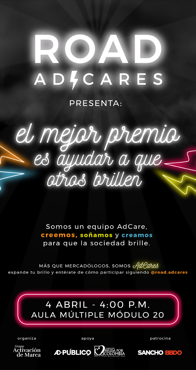 En esta última versión, Road AdCares contará con la participación de un aliado especial: la Fundación Ayuda por Colombia, una organización sin ánimo de lucro que trabaja con niños y jóvenes que viven en contextos de pobreza y vulnerabilidad. ¡Con tan solo participar puedes empezar a ser parte del cambio!, ya que puedes postular un copy creativo para la Fundación Ayuda por Colombia y ganar un premio desde la academia.