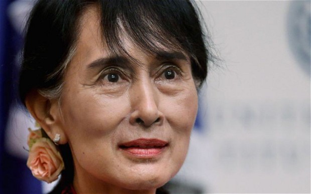 Hija del general nacionalista Aung San, organizador del moderno Ejército birmano y negociador con el Imperio Británico de la independencia nacional, el 19 de julio de 1947, con tan sólo dos años de edad, quedó huérfana del mismo al caer asesinado el prócer en un complot de sus adversarios; meses después, en enero de 1948, el país obtenía la independencia con el nombre de Unión de Birmania.