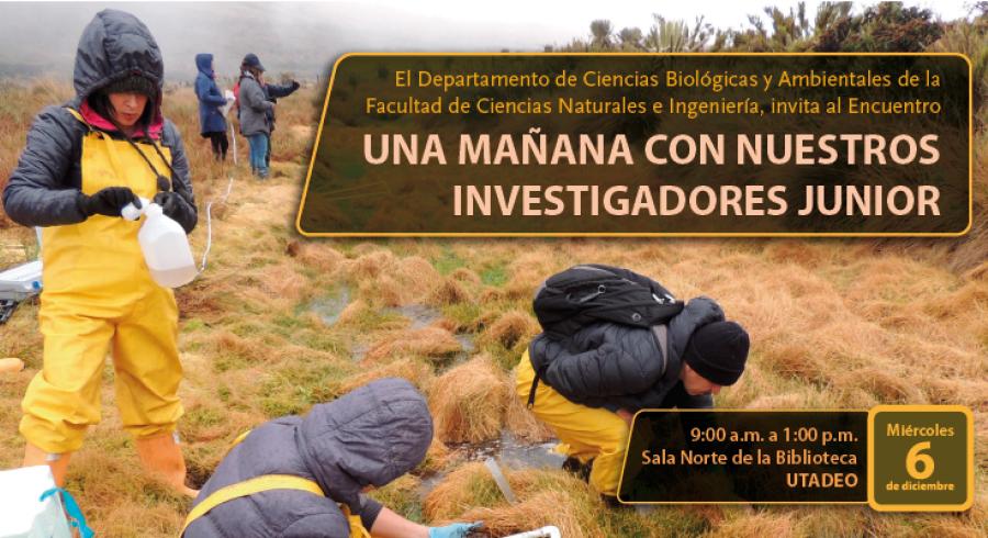 El Departamento de Ciencias Biológicas y Ambientales de la Facultad de Ciencias Naturales e Ingeniería tiene el gusto de invitar a toda la comunidad académica e investigativa de Utadeo al Encuentro Una mañana con nuestros investigadores junior, donde tendremos la posibilidad de compartir las experiencias científicas de nuestros estudiantes de los programas de Biología Marina y Biología Ambiental, que sustentaron sus tesis de grado a lo largo del 2017.