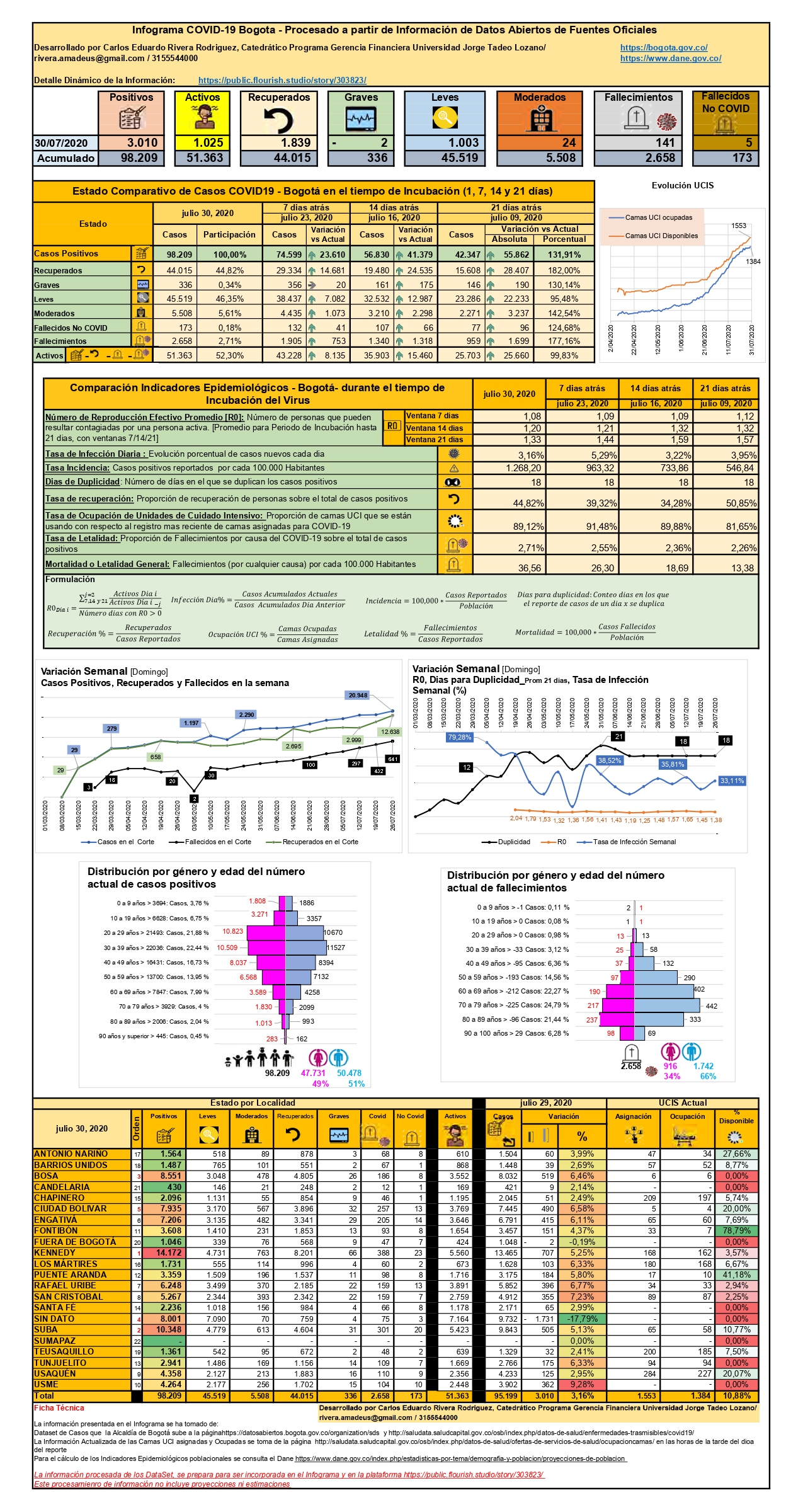 - El reporte del Observatorio de Salud de Bogotá indica, para el 30 de julio, una capacidad instalada de 1.553 camas UCIs, con una ocupación de 1.384 casos [336 confirmados / 1.048 probables]; la disponibilidad es del 10.88%