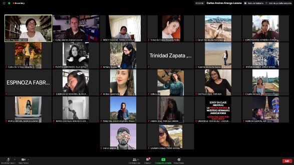 Conferencia virtual “Entendiendo el mundo sociocultural de los Centennials”, adelantada por la Universidad Católica de Perú (PUCP). Profesor Carlos Arango durante la charla, segundo cuadro parte superior derecha.
