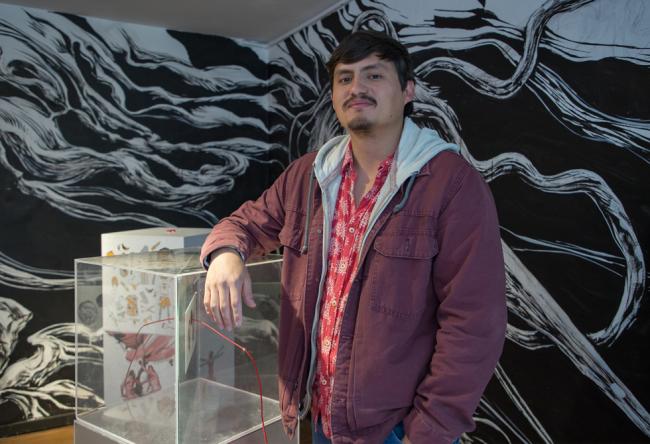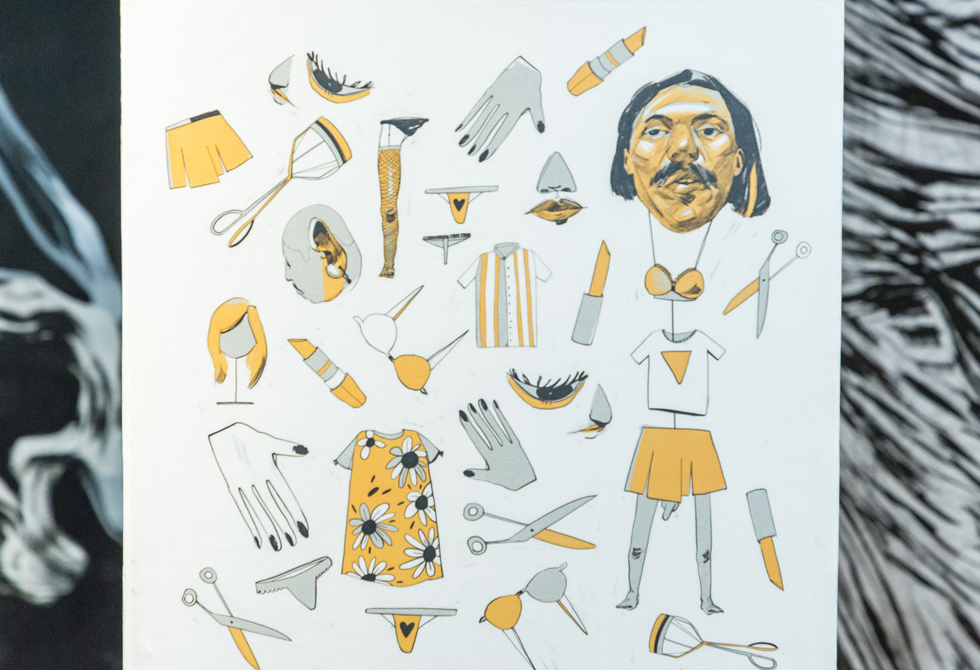 Con pinturas en acrílico, Camilo Acosta hace una análisis de estudio del canal de YouTube "Sin ánimo de ofender", un grupo de hombres que se reúnen a hacer comedia y que para este diseñador reflejan "machismo y masculinidades frágiles, mientras que el cuerpo de la mujer es visto como un objeto sexual".Estudiando la teoría de la risa, que expone Henri Bergson, en la que señala que la risa tiene un parte de complicidad, y El Manifiesto Cyborg, libro de Donna Haraway, Camilo ilustró un circuito en el que se correlacionaron imágenes que transgreden los límites de ciertas visiones del mundo. En los cubos se puede ver tres temas: una visión de mundo binario en el que la mujer es vista como objeto sexual, la sexualidad y el que transgrede los límites de la mirada.