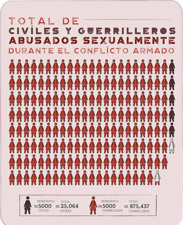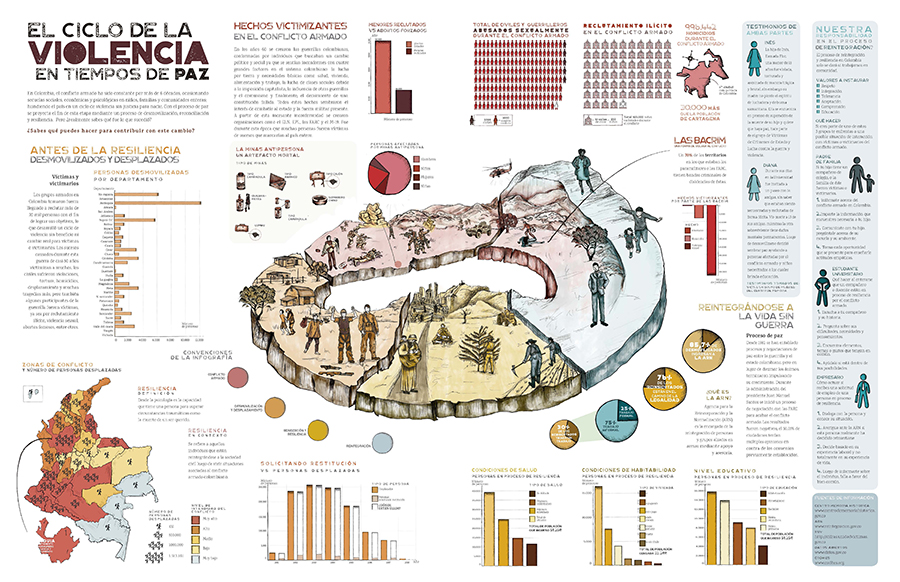 Así, bajo un esquema de diseño colaborativo, el concepto de la infografía se dividió en cinco segmentos. El primero tenía que ver con la desmitificación de quienes eran las víctimas del conflicto; el segundo aspecto se soporta en las gráficas sobre victimas de violencia sexual en el marco del conflicto, en una comparación entre militantes frente a población civil, demostrando que las personas más afectadas por este flagelo eran las primeras; en tercer lugar se presenta una estadística de los sectores del país con mayor desplazamiento; un elemento más tiene que ver con el estado actual de las acciones de reinserción, y por último, los testimonios alrededor de las experiencias de diálogo entre víctimas y victimarios, bajo el entendido que muchos de los victimarios también han sido victimas.