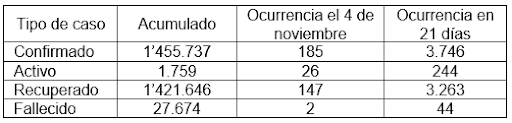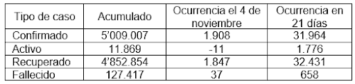 Un aspecto que permite analizar la ocurrencia de casos es el de las pruebas PCR, de las cuales a 4 de noviembre se han realizado 17’002.341, pero desde hace 21 días se tiene una tasa diaria en descenso al pasar del 0.15% al 0.11%, de allí que la positividad ha bajado del 23.92% al 23.45%.