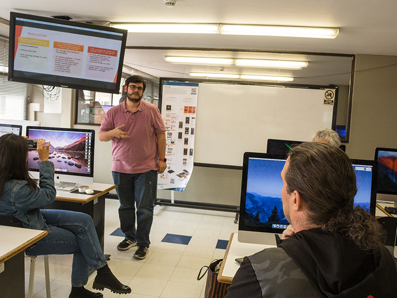 “Desde el año pasado venimos trabajando con el Departamento de Idiomas en el desarrollo de iniciativas que vinculan al departamento y los intereses del programa de Diseño Gráfico. A través de eso, surgieron iniciativas de lado y lado que permitieron hacer encuentros”, explicó Diego Restrepo, profesor de la asignatura. Durante el semestre, los estudiantes a su cargo contaron con el acompañamiento de las profesoras Lizeth Rojas y Joyce Wilches del Depto. de Idiomas, quienes los asesoraron para sus presentaciones orales y les abrieron un espacio de tutorías personalizadas.