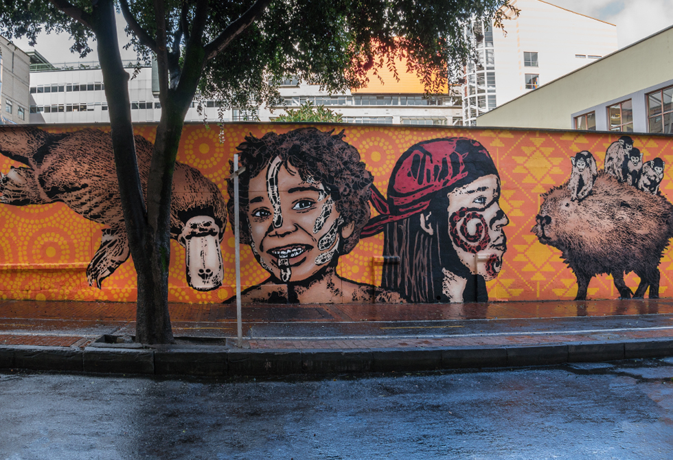 Fauna australiana y colombiana, al igual que la niñez indígena de los dos países forman el mural que de ahora en adelante dará vida a la calle 23. Esta intervención se realizó en el marco del Diálogo diplomático Australia-Colombia.
