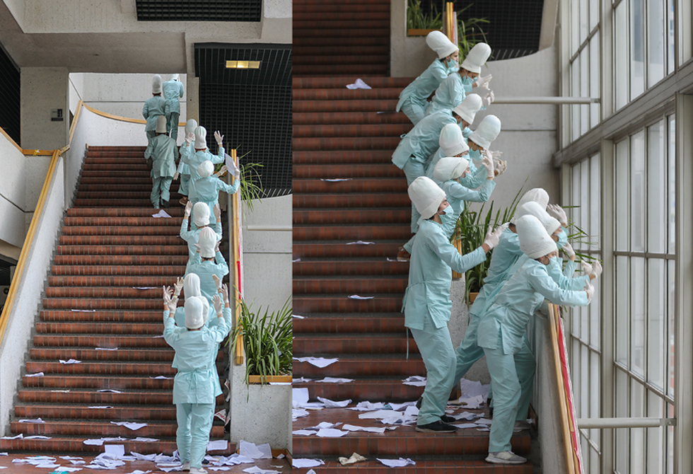 Durante ocho minutos las personas que transitaron por el lugar, tuvieron la oportunidad de ver el grupo escénico que representaba a médicos que subían y bajaban las escaleras en ese ajetreo, no solo por las emergencias que se viven a diario, sino que simulaban la crisis en medio de una pandemia, cualquier pandemia.