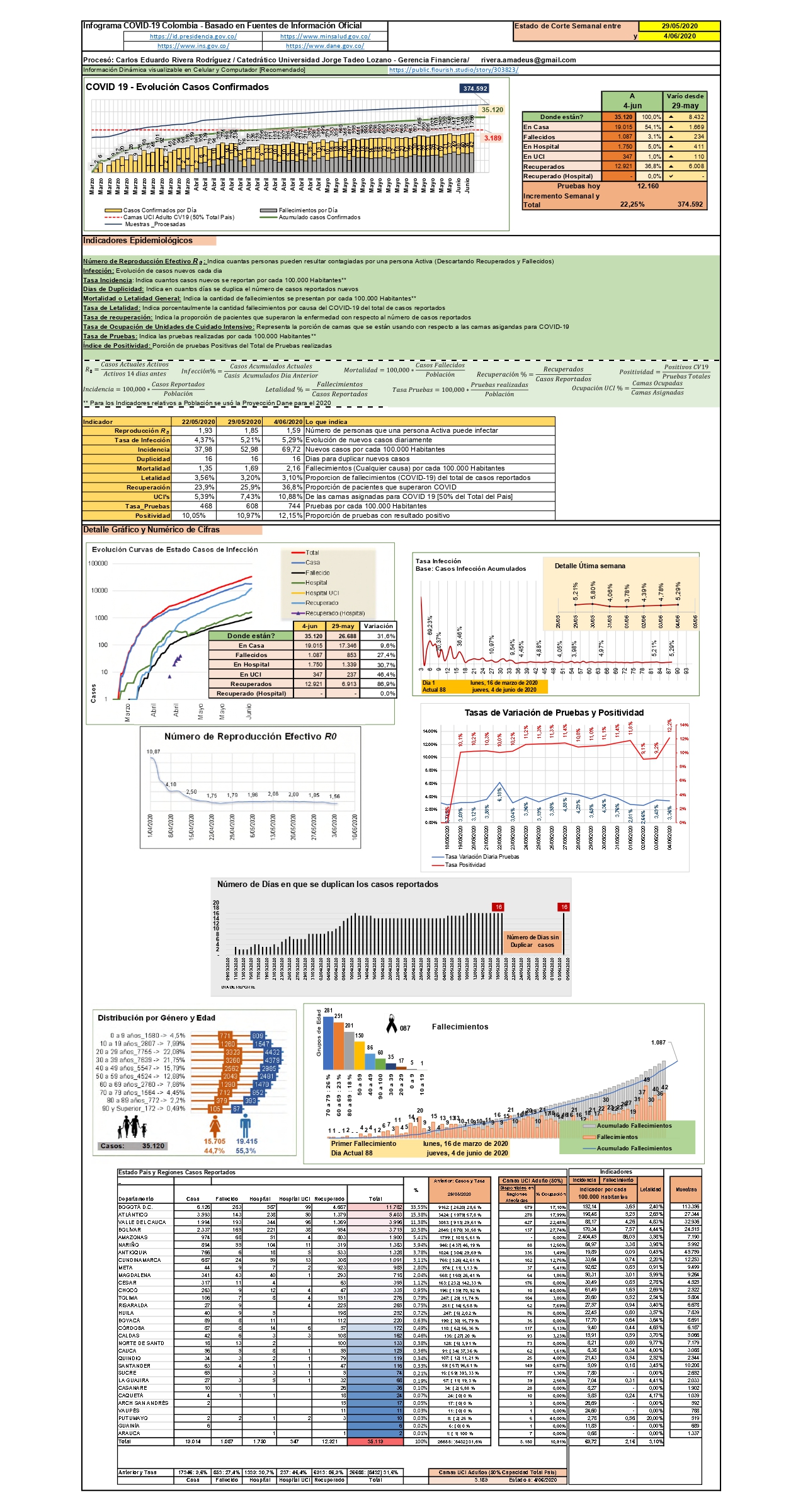 Desde que inició la emergencia sanitaria al país, las cifras se volvieron el tema cotidiano de los ciudadanos. En un principio hablamos solo de pocos contagios en uno u otro lado del país, y los modelos que se prepararon para el control de las cifras se desarrollaron quizás con esperanza de pasar este trecho del camino de forma rápida; pero las cifras fueron aumentando tanto en tamaño como en velocidad, y 85 días después del primer caso, llegamos a 35.120 personas calificadas como positivas al virus, pero también se destaca que el 36% de esas personas se han recuperado, es decir 12.921 personas. El 16 de marzo se reportó el primer fallecimiento, a 4 de junio ya se han tenido 1.087 decesos. El virus ya ha llegado a los diferentes puntos de la geografía nacional. Por ejemplo, en Bogotá la única localidad libre de contagios que quedaba era Sumapaz, pero desde el reporte del 4 de junio ya registra un caso; en Colombia, el único departamento con cero contagios es Guaviare.