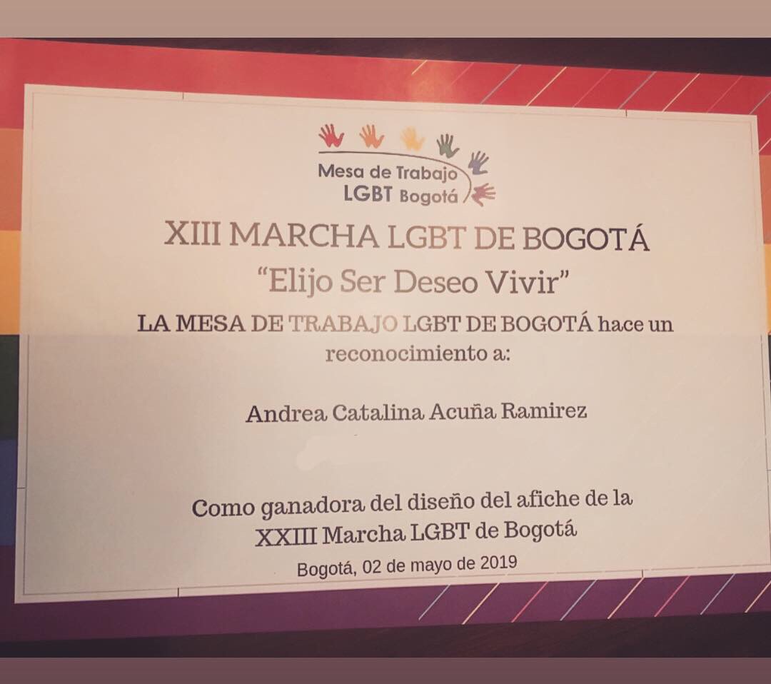 “Todo el salón decidió participar porque a estas convocatorias normalmente nadie se postula”, comenta Andrea. Cada uno de los estudiantes presentó una propuesta diferente y la ganadora fue Acuña. El reconocimiento fue entregado por Alejandro Mitchells, coordinador de la Mesa LGBT de Bogotá y como premio recibió un bono de consumo en el restaurante El Recreo de Adán.