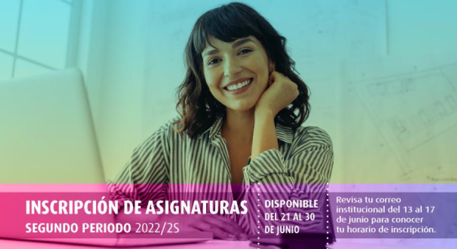 La inscripción de asignaturas para el periodo se realizará del 21 al 30 de junio del 2022. Te recomendamos estar pendiente de tu correo electrónico institucional entre el 13 y el 17 de junio, en el que recibirás la fecha y hora asignada para que realices tu horario.