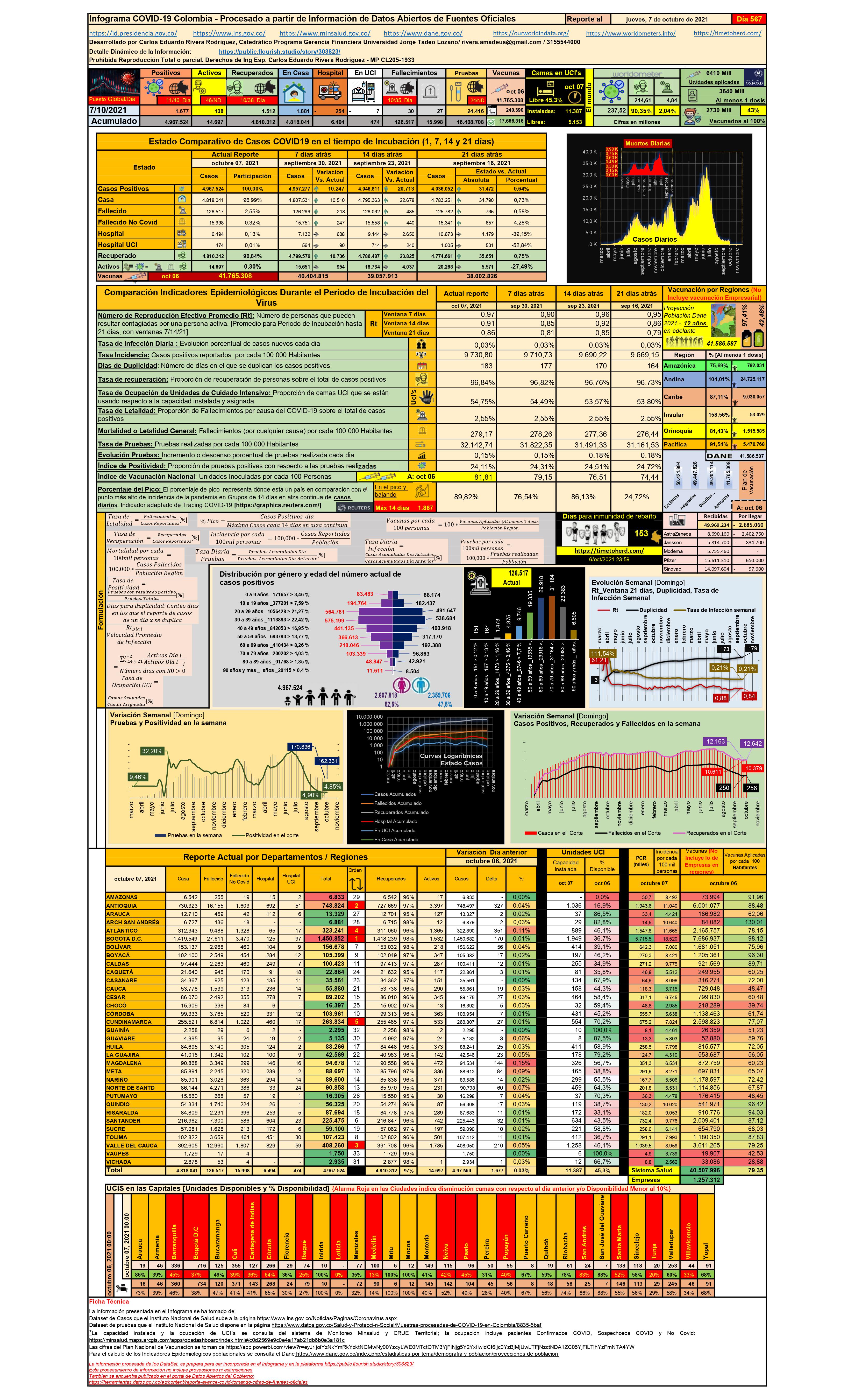 El país llegó a 4’967.524 casos positivos (Puesto 11 a nivel global), el 7 de octubre se presentaron 1.677 casos ocupando el puesto 46 en ocurrencia diaria; durante la primera semana del mes de octubre se presentaron 10.247 casos; respecto a la letalidad 126.517 personas han fallecido a causa del Covid19 (Puesto 10 en el mundo), y en un día se presentaron 30 eventos (Puesto 35 global), y durante los primeros 7 días de octubre fallecieron 218 personas, con un número promedio de reproducción de 7 días (Rt), paso de 0.90 a 0.97 posibles casos de infección por cada caso positivo.