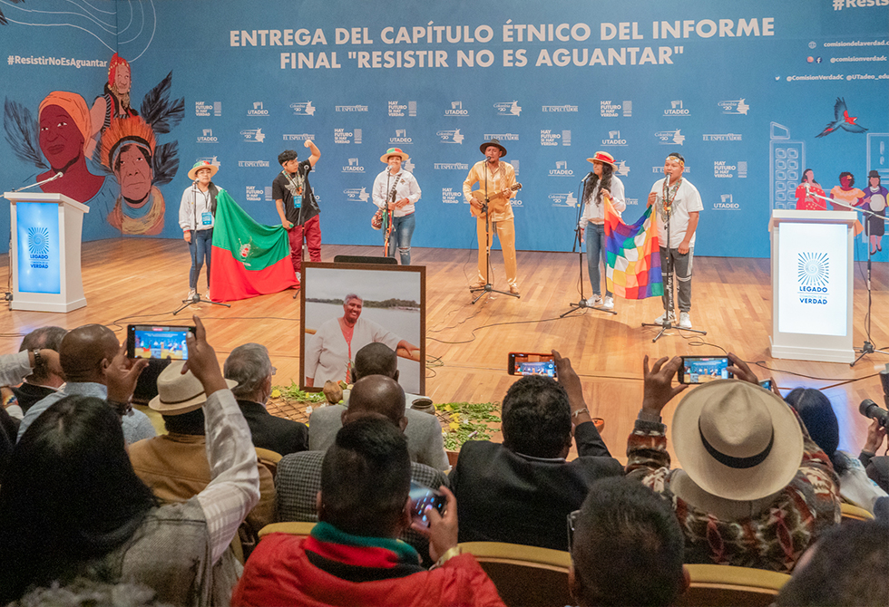 Durante la ceremonia se realizaron presentaciones culturales de las comunidades indígenas, afrocolombianas y el pueblo Rom. El público se vio conmovido por los homenajes en medio de los cuales se realizó la presentación del capítulo étnico del Informe Final de la Comisión de la Verdad.