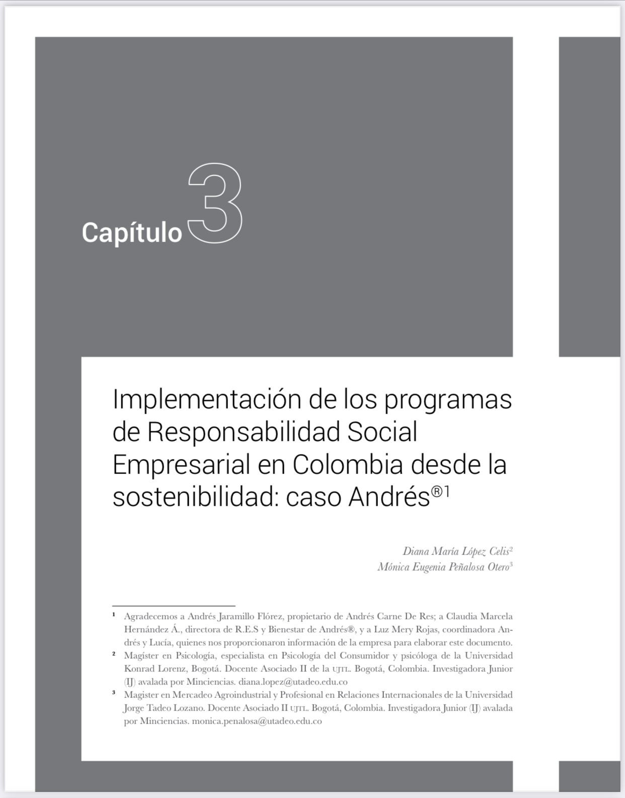 En primera instancia, Peñalosa y López tuvieron a su cargo el capítulo 3 titulado Implementación de los programas de Responsabilidad Social Empresarial en Colombia desde la sostenibilidad: caso Andrés®. En él evidencian cómo las empresas juegan un papel fundamental como responsables directos del daño al medio ambiente, independientemente de las actividades que desarrollen en su entorno económico.