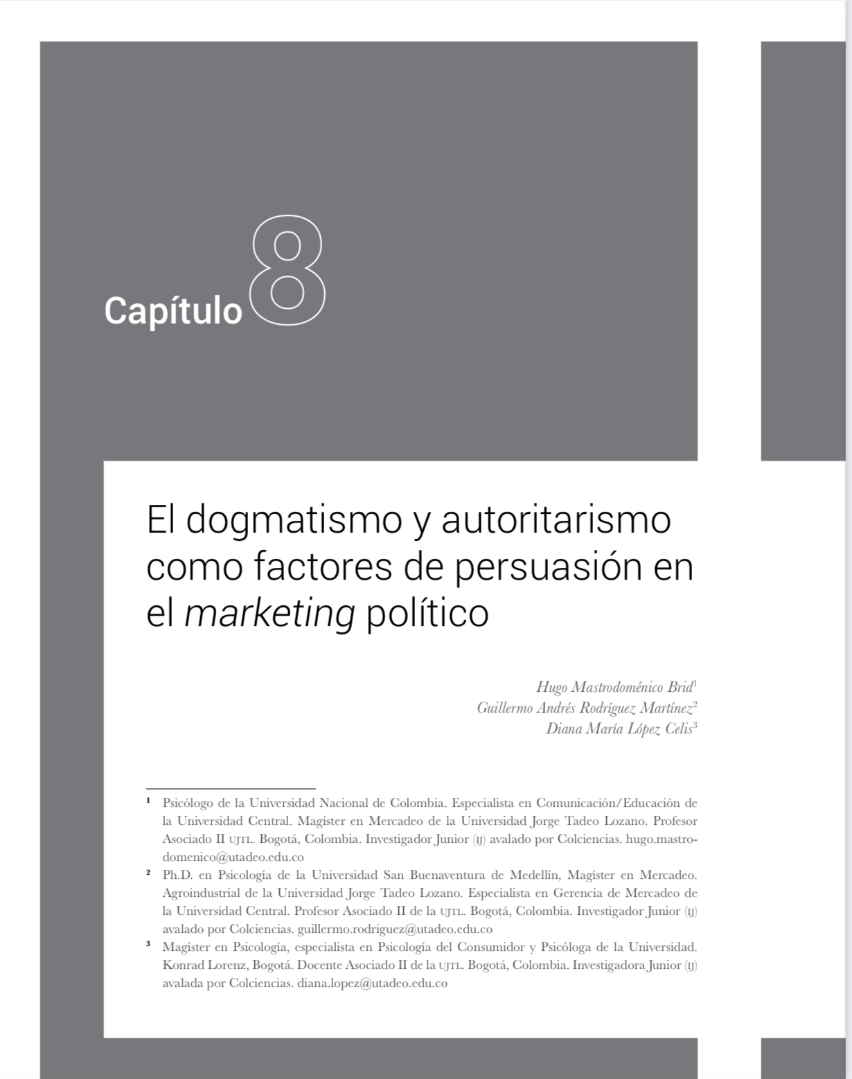 Finalmente, Rodríguez, López y Mastrodoménico, escribieron el capítulo 8 titulado El dogmatismo y el autoritarismo como factores de persuasión en el marketing político. Se concluye que los ciudadanos somos parcial o totalmente propensos a aceptar las ideas dogmáticas y autoritarias y a concederles credibilidad a los caudillos populistas de cualquier ideología que posan de salvadores pero que en el fondo tienen una agenda personal egocéntrica.
