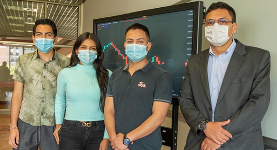 En la fotografía: Sara Bohórquez Muñoz, del programa de Comercio Internacional y Finanzas; Santiago Chisco Gutiérrez, del programa de Derecho; Laura Stefanía Zea Piña, del programa de Banca y Finanzas; Deivid Nectario Torres Erazo, del programa de Comercio Internacional y Finanzas. Karen Daniela Hernández Álvarez, del programa de Economía, también conformó el grupo ganador.