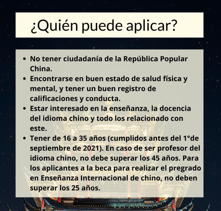 Los estudiantes internacionales que actualmente están estudiando en China no pueden aplicar. | Se le dará prioridad a los aplicantes que tengan un certidicado de HSKK | |