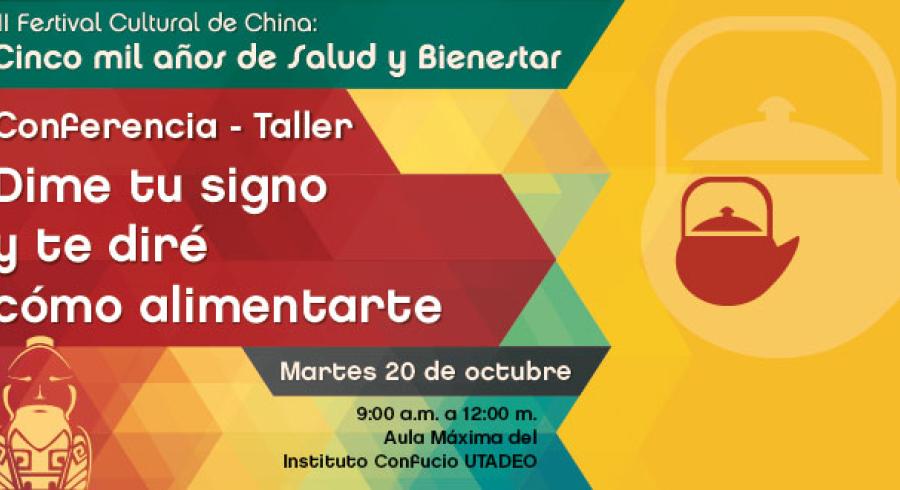 El Instituto Confucio Utadeo te invita a asistir a la conferencia-taller “Dime tu signo y te diré cómo alimentarte” el martes 20 de octubre a las 9:00a.m., liderado por María Fernanda Gómez, experta en el tema, que nos ayudara a entender cómo la alimentación puede equilibrar nuestro cuerpo y nuestro espíritu y qué tipo de alimentos son recomendados para cada caso.