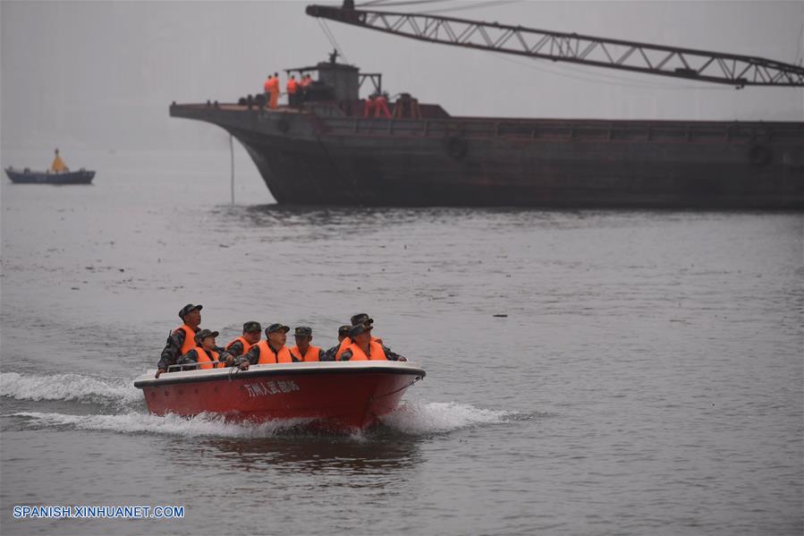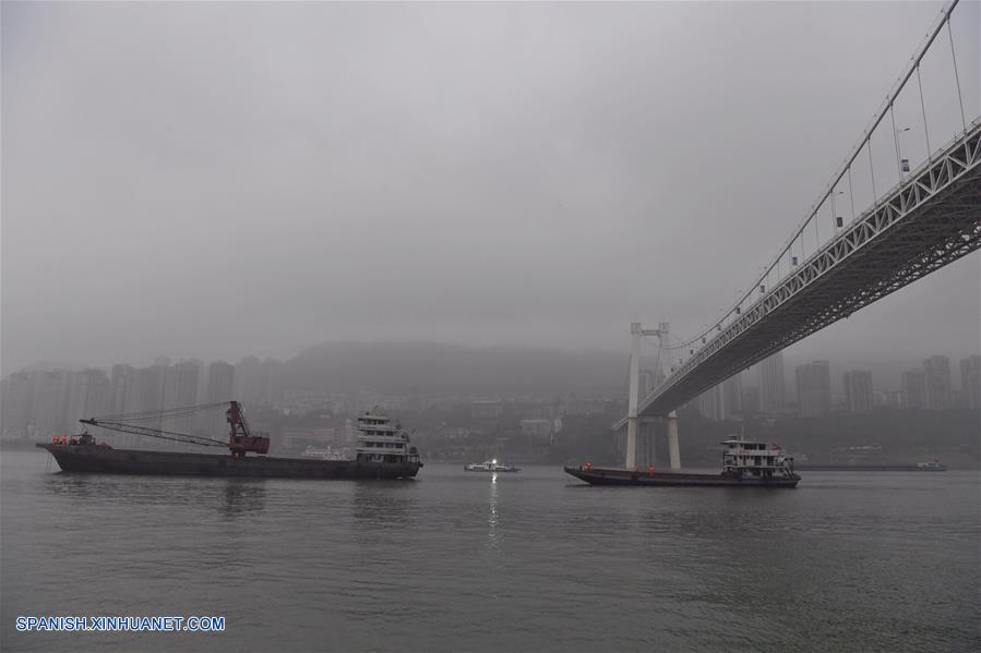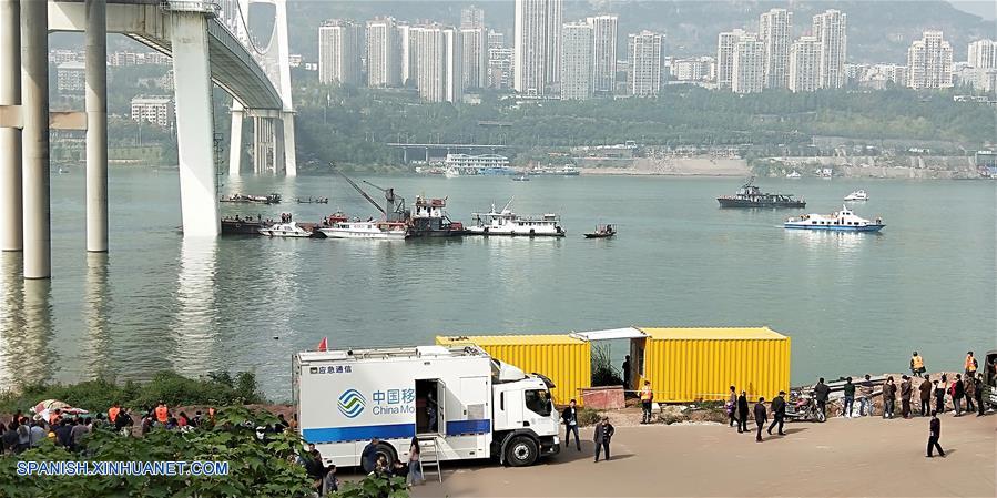 CHONGQING, octubre 29, 2018 (Xinhua) -- Rescatistas trabajan en el sitio donde ocurrió un accidente de autobús, en el distrito de Wanzhou, en Chongqing, en el suroeste de China, el 29 de octubre de 2018. Un autobús con una docena de pasajeros a bordo giró repentinamente el domingo hacia el carril contrario de la carretera y chocó contra un auto privado antes de caer en el río Yangtse en Chongqing, en el suroeste de China, dijo la policía local. Dos cuerpos habían sido recuperados del río hasta las 20:00 horas y el trabajo de rescate continúa. Más de 20 botes de rescate han llegado al sitio para llevar a cabo operaciones de salvamento. (Xinhua/Wang Quanchao)