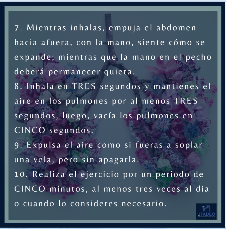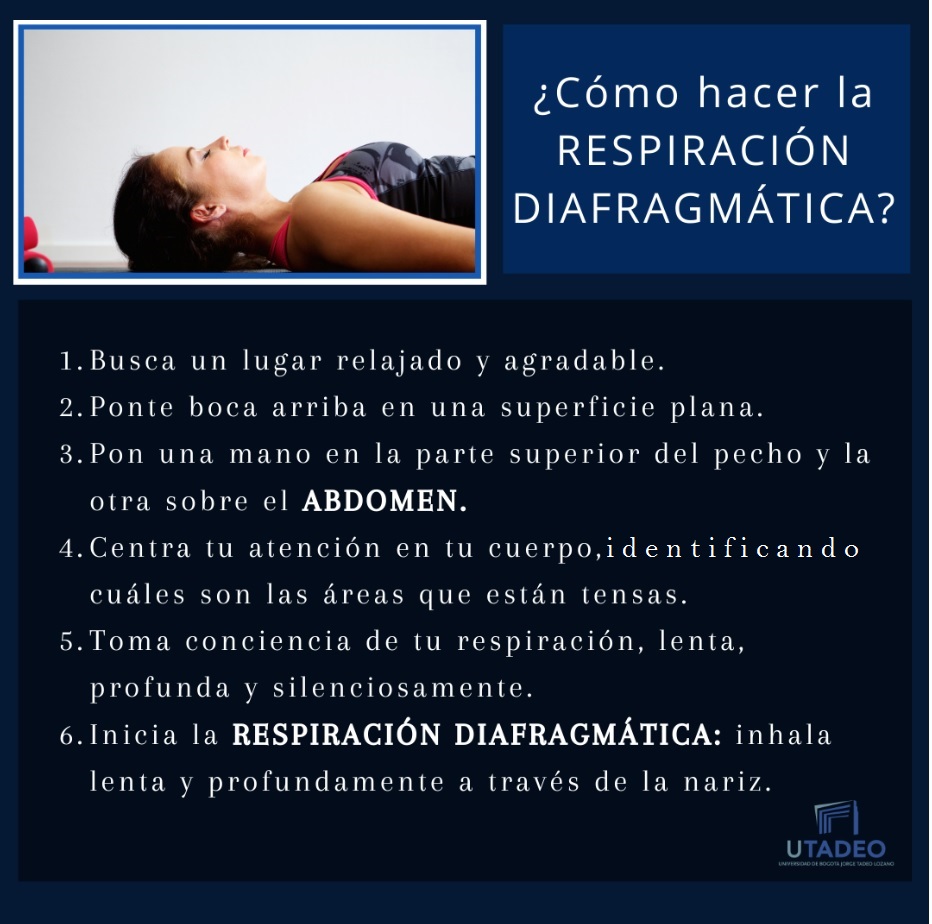 DestacadasPractica la respiración diafragmática para relajarte Compartir en Miércoles, Octubre 21, 2020Es una técnica que ayuda al control y autocontrol de los síntomas de la ANSIEDAD."Quien domina el arte de relajarse, posee la llave que abre las puertas de la salud" Helena Echeverría respiracion_diafragmatica_1.jpg respiracion_diafragmatica_2.2.jpg respiracion_diafragmatica_3.jpg