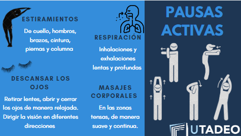 Si tienes que realizar labores en casa o estás cumpliendo con las responsabilidades de la universidad o el trabajo de forma virtual, separa un tiempo para hacer una pausa y descansar tu cuerpo y tu mente. La OMS recomienda que se realicen estas pausas cada 3 horas ya que “las personas que trabajan frente a un computador son las más propensas a sufrir de ciertos dolores, porque su actividad estática y repetitiva les genera desgaste físico y mental”. (Universidad de las Américas, 2011)