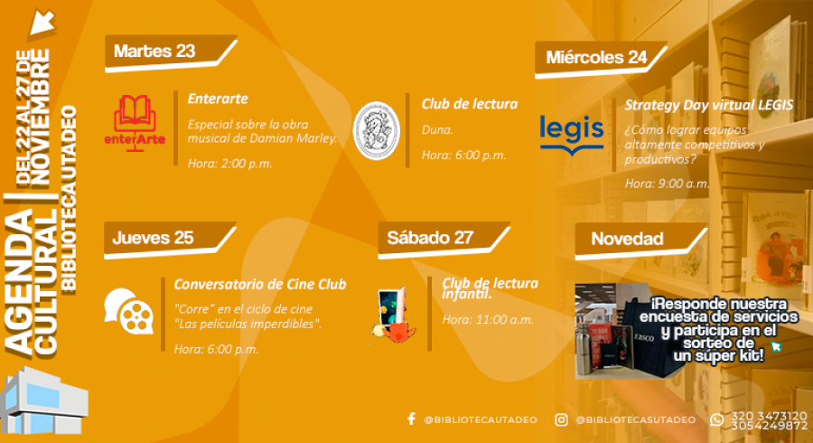 Agenda cultural de tu Biblioteca UTadeo de la semana del 22 al 27 de noviembre.