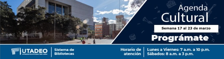 DestacadasAGENDA SEMANAL - BIBLIOTECA UTADEO Compartir en Domingo, Marzo 17, 2024Prográmate con los eventos que trae el Sistema de Bibliotecas U. Tadeo del 17 al 23 de marzo de 2024Prográmate con los eventos que trae el Sistema de Bibliotecas U. Tadeo del 17 al 23 de marzo de 2024Martes 19 Creación literaria - IdartesHora: 3 p.m.Plaza Idiomas Biblioteca, piso 3 Taller Formación Audiovisual - IdartesHora: 3 p.m. Plaza Cómic Biblioteca, piso 3Miércoles 20Café et ParoleHora: 1 p.m.Biblioteca Utadeo, piso 3, sala de idiomas Jueves21EnterArtePrograma: Artistas femeninasHora: 11 a.m.Creación literaria - IdartesHora: 3 p.m.Plaza Idiomas Biblioteca, piso 3 Taller Formación Audiovisual - IdartesHora: 3 p.m. Plaza Cómic Biblioteca, piso 3 Viernes22 Torneo Relámpago SabelotodoHora: 2 p.m. Biblioteca, piso 4