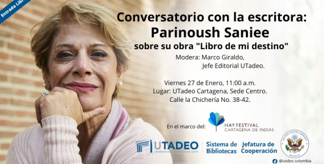 Con motivo del Hay Festival que se desarrolla en la ciudad de Cartagena de Indias, la Embajada de Estados Unidos en Colombia, la Universidad de Bogotá Jorge Tadeo Lozano Seccional Caribe, el Sistema de Bibliotecas y la Jefatura de Cooperación de la misma universidad, le invitan al Conversatorio con la escritora Parinoush Saniee sobre su obra "El libro de mi destino".