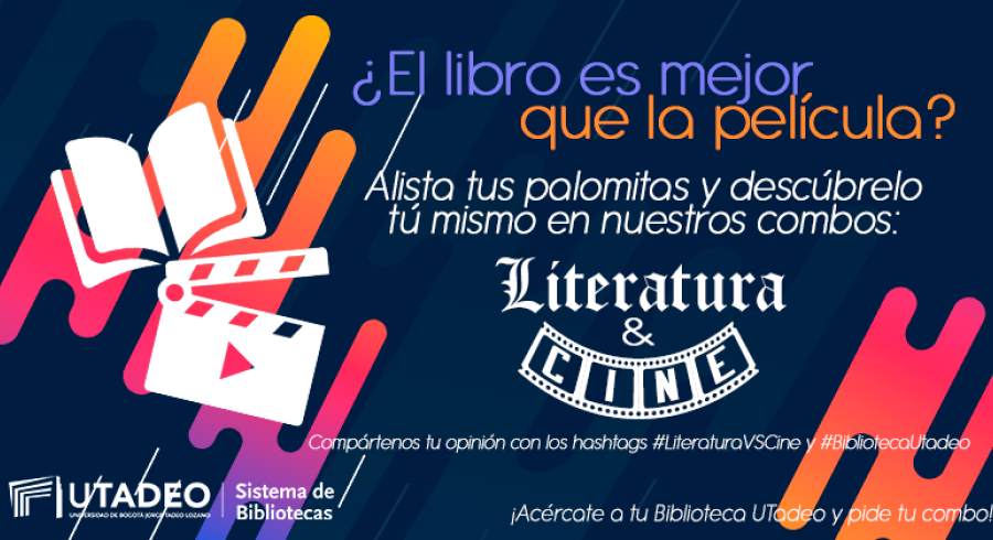 ¡Bienvenido a tu biblioteca UTadeo! Estamos felices de tenerte de regreso y por esto durante el mes de abril acércate a tu biblioteca y encontrarás combos variados de Libro y Película, escoge tu favorito, solicita el préstamo ¡y disfruta! Después compártenos tu opinión por redes sociales con los hashtags #LiteraturaVSCine y #BibliotecaUtadeo. Recuerda que contamos con todas las medidas de bioseguridad porque tu Biblioteca UTadeo te cuida.
