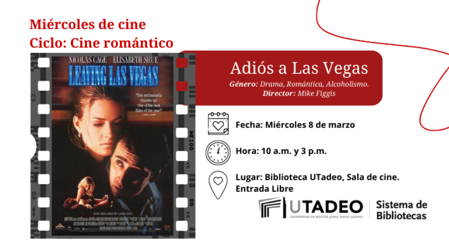 DestacadasMiércoles de cine: Adiós a Las Vegas Compartir en Martes, Marzo 7, 2023Programación Miércoles de cine 2023♥ Te invitamos a disfrutar la película “Adiós a Las Vegas" Fecha: Miércoles, 08 de marzoCiclo: Cine románticoHora: 10 a.m. y 3:00 p.m.Lugar: Sala de cine, cuarto pisoEntrada libreTrailer: