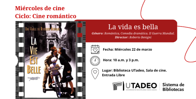 DestacadasMiércoles de cine: La vida es bella Compartir en Miércoles, Marzo 22, 2023Programación Miércoles de cine 2023♥ Te invitamos a disfrutar la película “La vida es bella" Fecha: Miércoles, 22 de marzoCiclo: Cine románticoHora: 10 a.m. y 3 p.m.Lugar: Sala de cine, cuarto pisoEntrada libreTrailer: