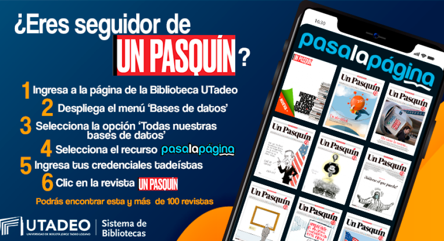 1. Ingresa a la página de la Biblioteca UTadeo. 2. Despliega el menú 'Bases de datos'. 3. Selecciona la opción 'Todas nuestras bases de datos'. 4. Selecciona el recurso 'PasaLaPágina'. 5. Ingresa tus credenciales tadeístas. 6. Clic en la revista 'Un Pasquín'.