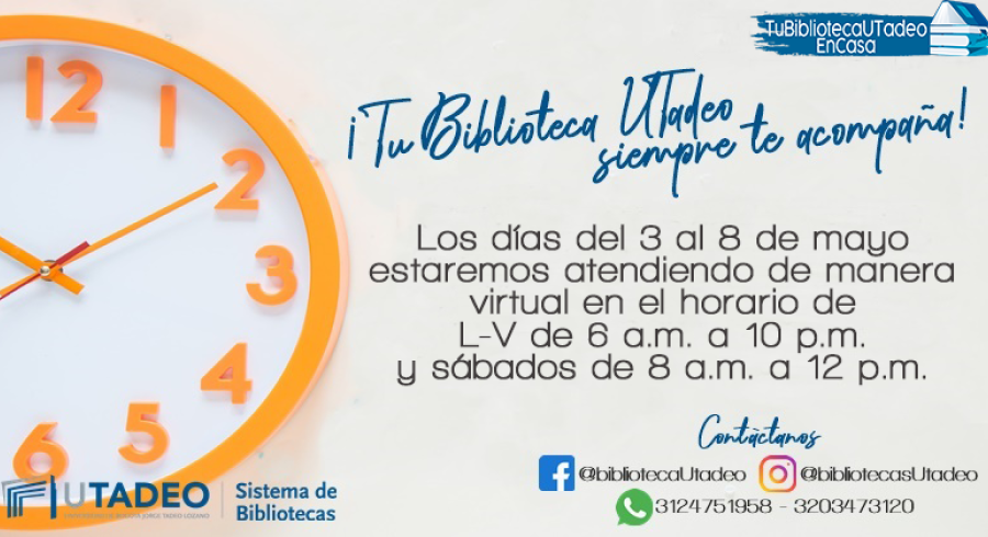 ¡Tu Biblioteca UTadeo siempre te acompaña! Los días del 3 al 8 de mayo estaremos atendiendo de manera virtual en el horario de L-V de 6 a.m. a 10 p.m. y sábados de 8 a.m. a 12 p.m.
