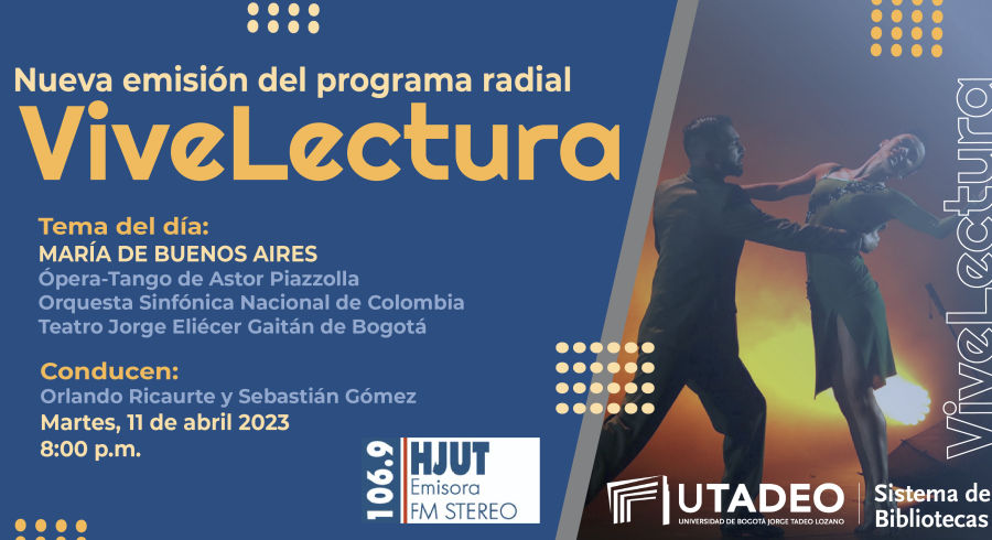 DestacadasViveLectura Compartir en Martes, Abril 11, 2023 Programa radial ViveLectura, Tema del día.¡Hoy ViveLectura se contagia de los ritmos sensuales y endiablados del tangoen “María de Buenos Aires”, la obra maestra y revolucionaria del padre del Nuevo Tango: Astor Piazzolla! ♪