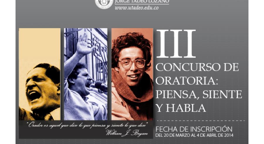 El día lunes 12 de mayo, se celebró la final III CONCURSO DE INTERNO DE ORATORIA Y ARGUMENTACIÓN: PIENSA, SIENTE, Y HABLA.  Este concurso, organizado por los Programas de Derecho, Ciencia Política y Gobierno, y Relaciones Internacionales de la Facultad de Ciencias Sociales de la Universidad de Bogotá Jorge Tadeo Lozano, pretende promover el desarrollo de la correcta expresión oral y argumentativa de nuestros estudiantes, como componentes vitales del desarrollo científico, académico y profesional. Así mismo, el concurso pretende la generación de espacios extracurriculares que incentiven una formación reflexiva, dinámica y participativa.