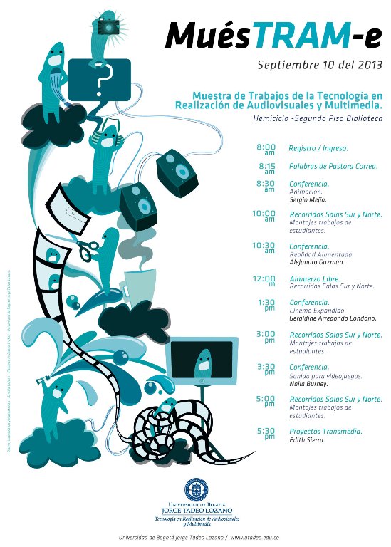 La Tecnología en Realización de Audiovisuales y Multimedia de la Tadeo invita a todos los estudiantes de la Universidad a "MuésTRAM-e", una exhibición con los mejores trabajos del programa, así como con importantes conferencias sobre Animación, Realidad Aumentada, Cinema Expandido, Sonido para Videojuegos y Proyectos Transmedia, dictadas por reconocidos conferencistas nacionales.