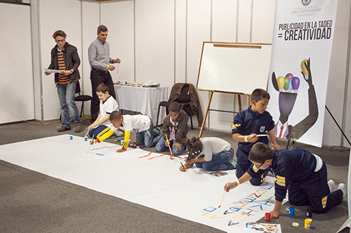 En la primera jornada en la que participaron estudiantes de colegios de Cartagena, el municipio de Lenguazaque, La Guajira y Bogotá, el docente del programa de Publicidad, Guillermo Andrés Rodríguez, guió a los pequeños estudiantes para que plasmaran en una gran tela, mensajes positivos que buscaban dejarle enseñanzas a los visitantes del pabellón.