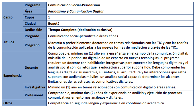 La Universidad de Bogotá Jorge Tadeo Lozano requiere vincular a partir de enero de 2015, un profesor de tiempo completo para el Programa de Comunicación Social-Periodismo en la Facultad de Ciencias Sociales de Bogotá.